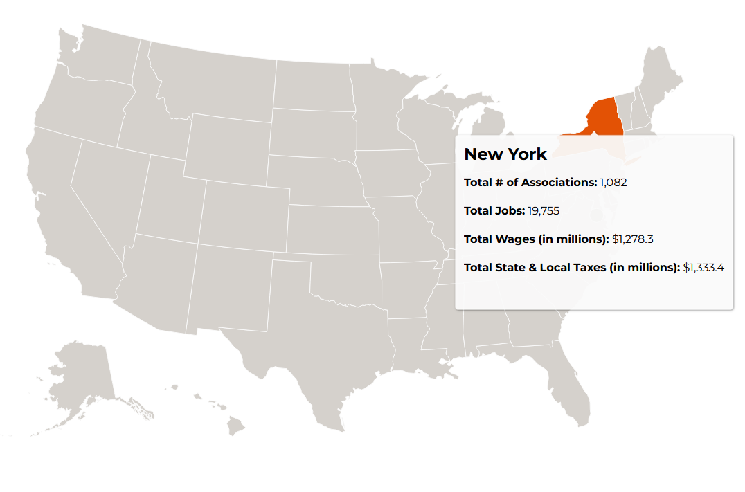 - Job Creation: Nearly 20,000 New Yorkers are employed by associations. - Economic Impact: Associations infuse over $1.2 billion in wages and generate over $1.3 billion in local and state taxes annually. - Meeting Industry Leadership: Associations organize events that support hospitality and tourism industries.