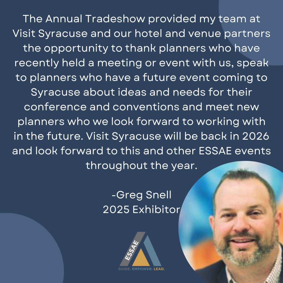 Ignite your business at ESSAE's Annual Trade Show! This is your chance to connect directly with association industry leaders and showcase your latest innovations and business solutions. Engage in exclusive networking and exciting in-depth educational sessions as you elevate your brand, spark new partnerships, and generate valuable leads. Don’t miss this unforgettable experience – your next big opportunity awaits!